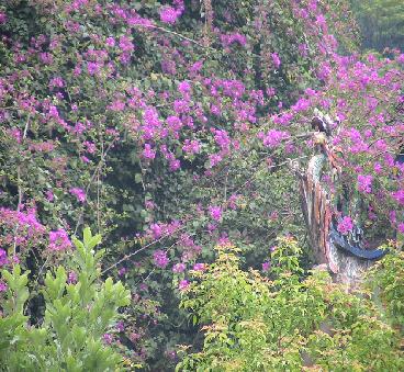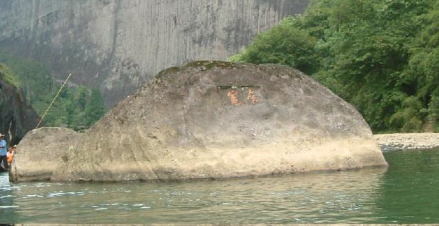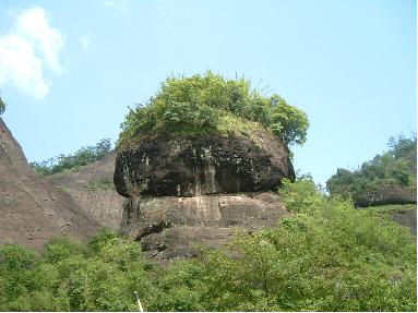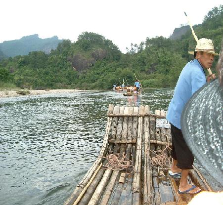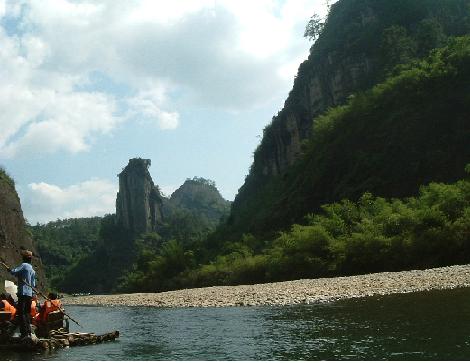 舟は武夷三十六峰、晩対(ばんつい)・天柱・玉華・接笋(せつじゅん)・隠屏(いんぺい)・天游・玉女・獅子・大王の峰々を 下から見上げながら進んでいく。広西自治区にある景勝地、桂林からはだいぶ北になるからなのだろうか、岩壁に植生する木々が 桂林のキンモクセイをはじめとするモクセイだけだったのに対し、武夷の岩肌には松や竹など樹木種類が豊富である。