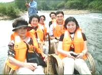 筏は孟宗竹の先を熱で曲げ八本で組みそれを二つ合わせてその上に竹椅子を六つ縛って固定させている。六人乗ると竹は水中に入り、 足を浮かせなければ足は水に浸かる。きわめて危うい舟だが竹でなければこの風情は出ない。船頭二人が、竹棹を差し川底の石をつく音は いかにも竹の響音である。