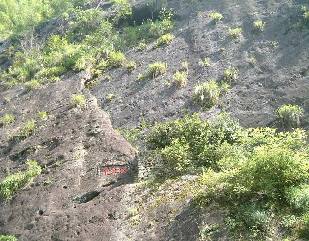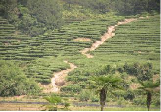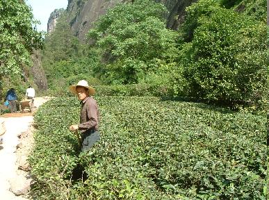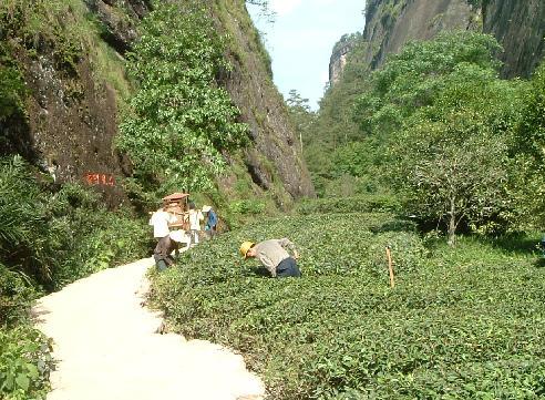 「大紅袍」と書かれた入口で入場料を払いおよそ20分ぐらい軽いピクニック気分で岩場を歩く。途中の岩と岩の間の僅かな畑には 隙間無く茶が植えられていて農夫達の手で鍬が入れられている。
