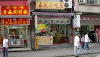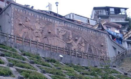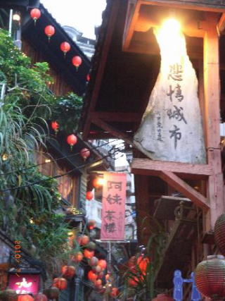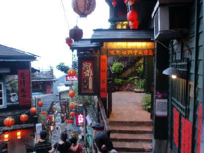 グーグルの地図で見ると九份はほぼ北西に向かう斜面に町が形成され斜面に直角に石段がある。斜面に沿って軽便路や基山街など何本かの小道があって豎崎路の中程、軽便路と交わったあたりから賑やかな街並みが造られている。ガイドブックに出てくるようなレトロ調の建物が建ち並び、酒家(食堂)や喫茶店、土産物屋に改装されて営業されている。