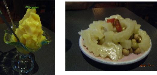 基山街を歩いて千尋の両親が豚になったあたりの店に入ってみる。間の悪い時なのか客はほかに誰もいない。ドアを開けたとたん今まで客席に座っていた女性達が一斉に立ち上がって持ち場に着く。せっかく休んでいたのに悪かったかなと思いながら、此処でもマンゴシャーベットそしてゴーヤの甘酢漬けを注文する。ゴーヤが白いのが面白い。