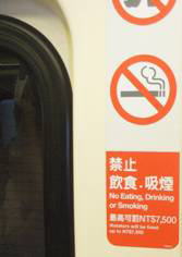 禁煙のマークと飲食禁止のマーク、MRT内では煙草はもちろんのこと飲食も禁じられている。