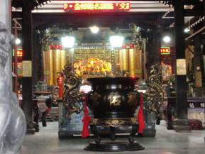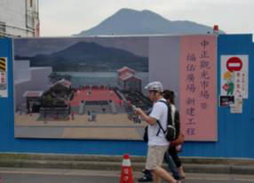 淡水は河口に夕陽が落ちる景色がクライマックスだという。あいにくこの日は海岸線の雲が厚くサンセットを見るのに適した黄昏時ではなかった。しかし河を挟んで向かい側に聳える山はくっきりと美しい山姿を見せてくれ。まさに聖山と思える趣である。河の此岸にはその拝殿とおぼしき福佑宮という建物が中正路のほぼ中途にあって土地の人たちは門前で一礼をしながら通っていく。環河道路との間には一時、何かが建てられていたのだろうか、最近取り壊され山を拝めるように整備される計画があると大きな立て看板が掲示されていた。
